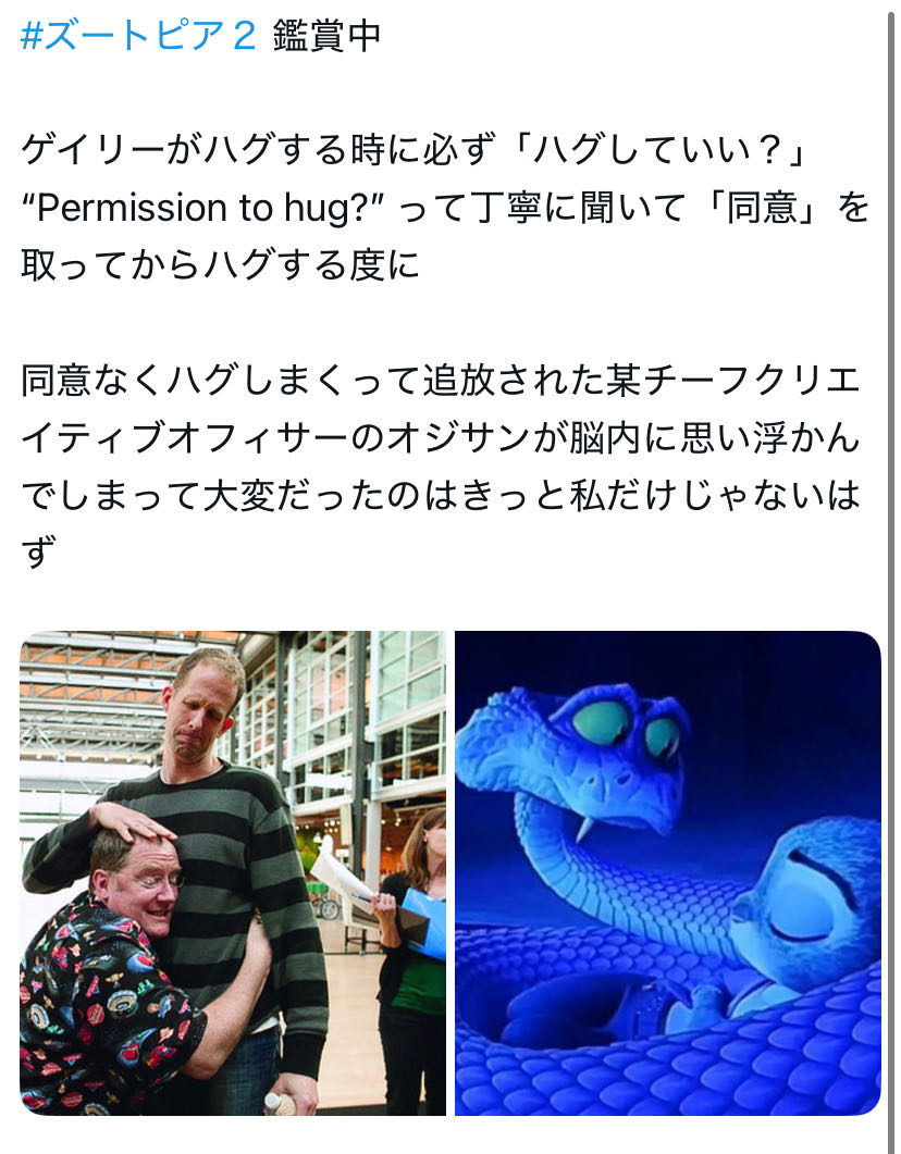| … | 1125/12/16(火)07:06:11No.1382984280そうだねx19ラセターはハメられたんだ!って言われるけどドキュメンタリー見るとマジで所構わずハグ連発していてコイツ……ってなったからまあマジなんだろうな |