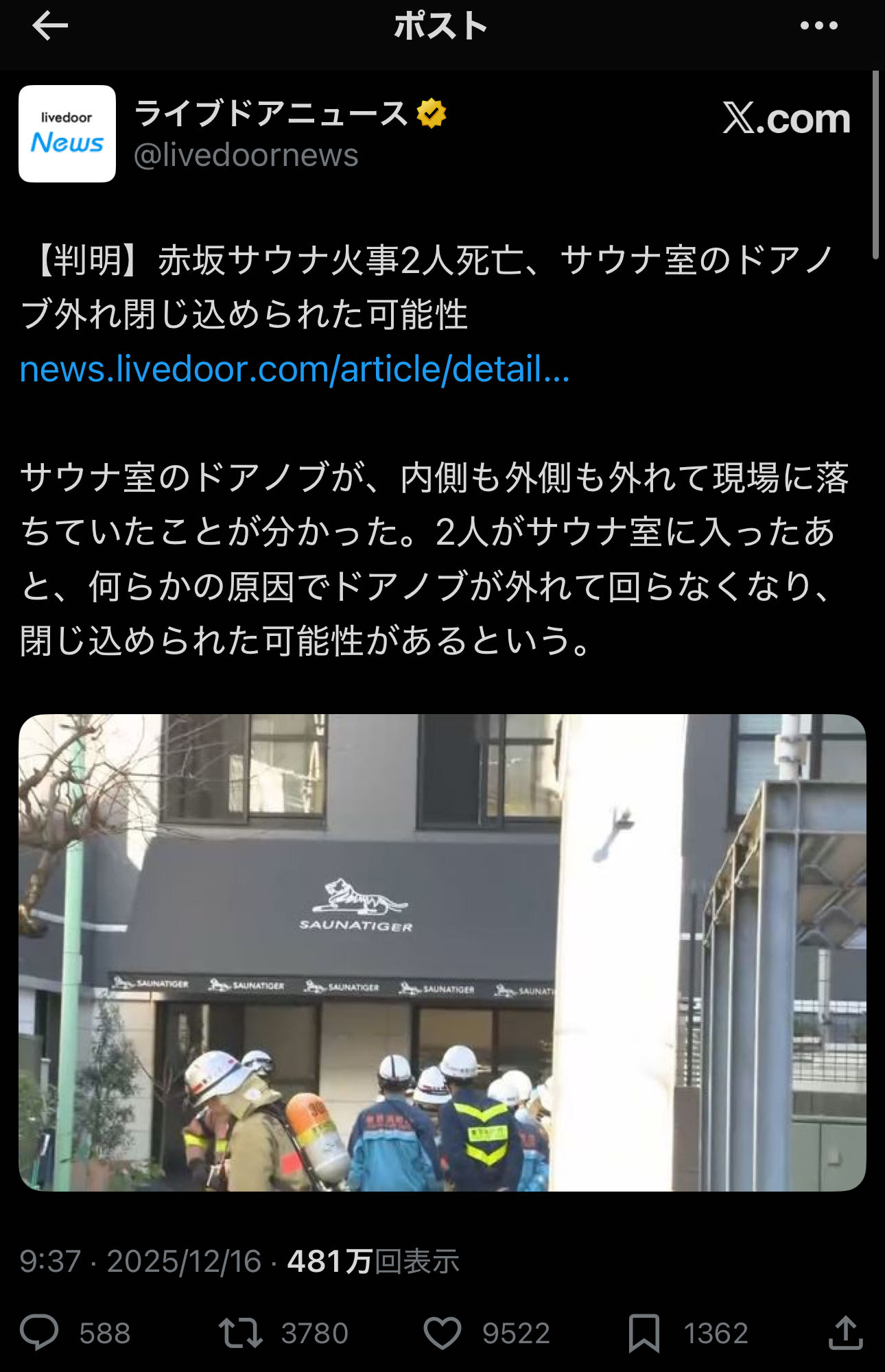 | … | 78025/12/16(火)14:33:02No.1383071452+事故があったのはサウナタイガーって店なんだけど同じく赤坂にあって同じく会員制で同じくドアノブ式なアカサカサウナがなんか風評被害受けてる! |