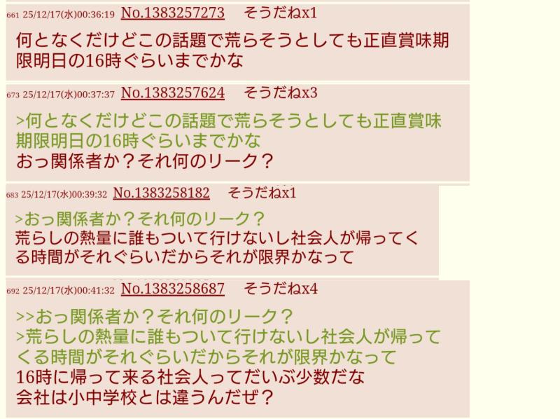 | … | 80425/12/17(水)01:11:44No.1383265609そうだねx2>>16時退勤くん居なくなったからどっか違うスレに逃げた? |