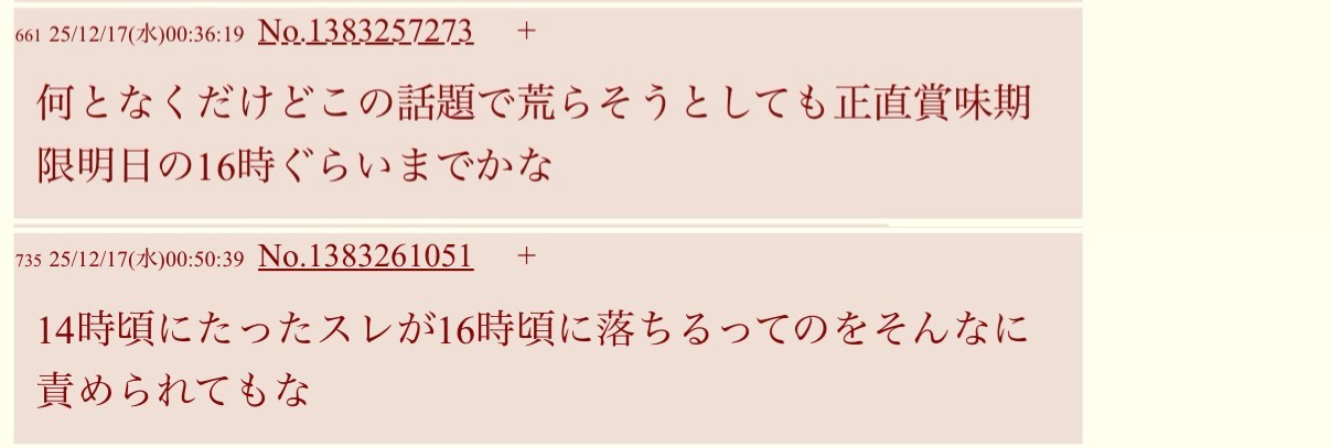 | … | 74125/12/17(水)00:52:15No.1383261436そうだねx5>14時頃にたったスレが16時頃に落ちるってのをそんなに責められてもな |