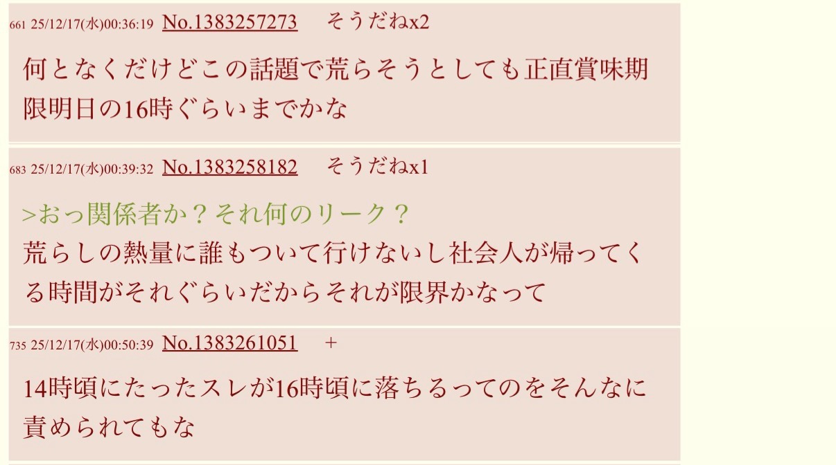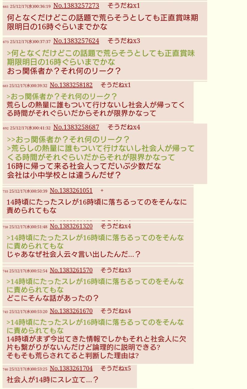 | … | 74625/12/17(水)00:53:25No.1383261704そうだねx5社会人が14時にスレ立て…? |
