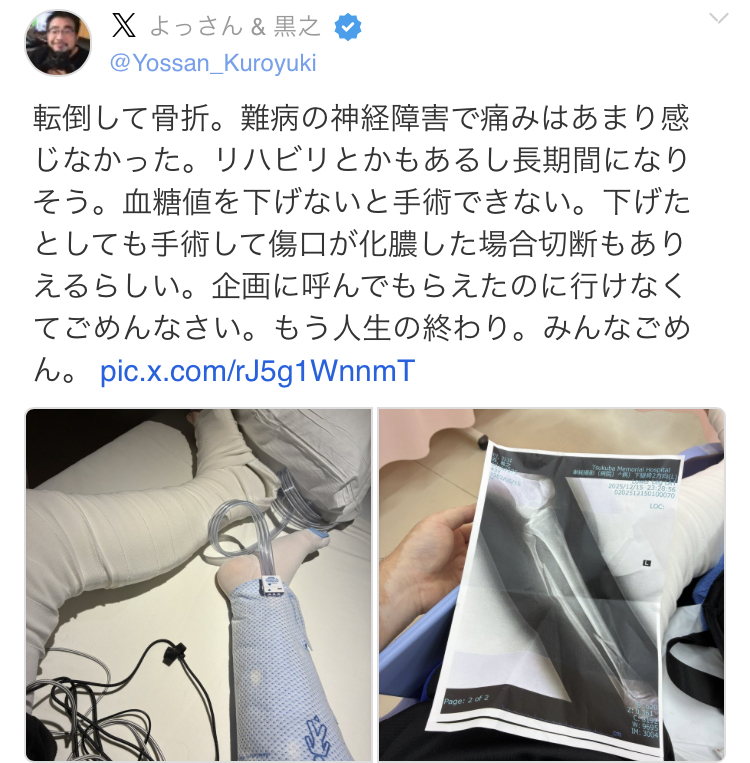 | … | 225/12/17(水)08:15:14No.1383298205そうだねx6病気してると怪我でこういうことになるんだな… |