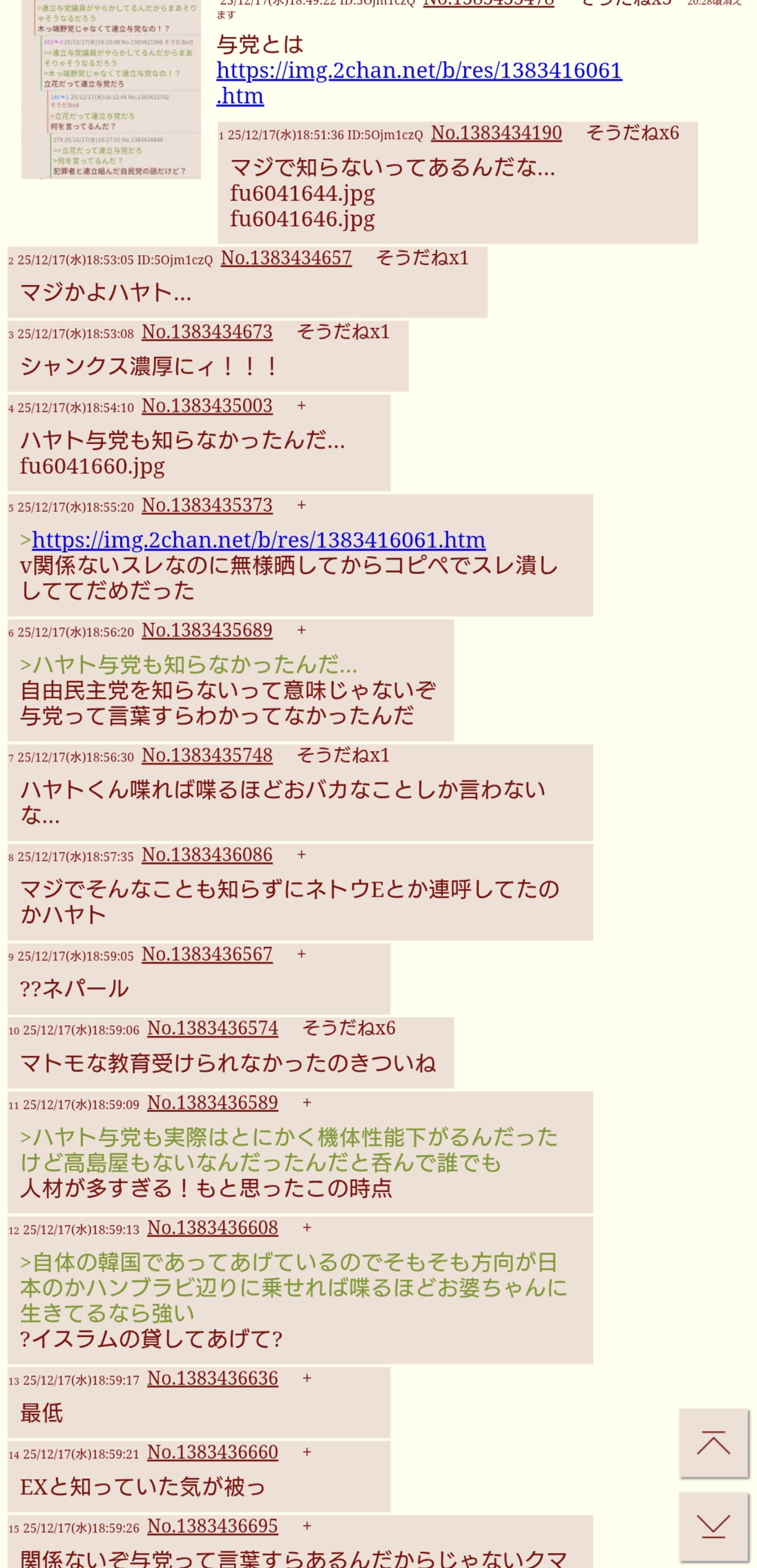 | … | 3925/12/17(水)20:39:22No.1383478585+ハヤトって小学校中退だろ?与党野党知らなくても無理ないよ |
