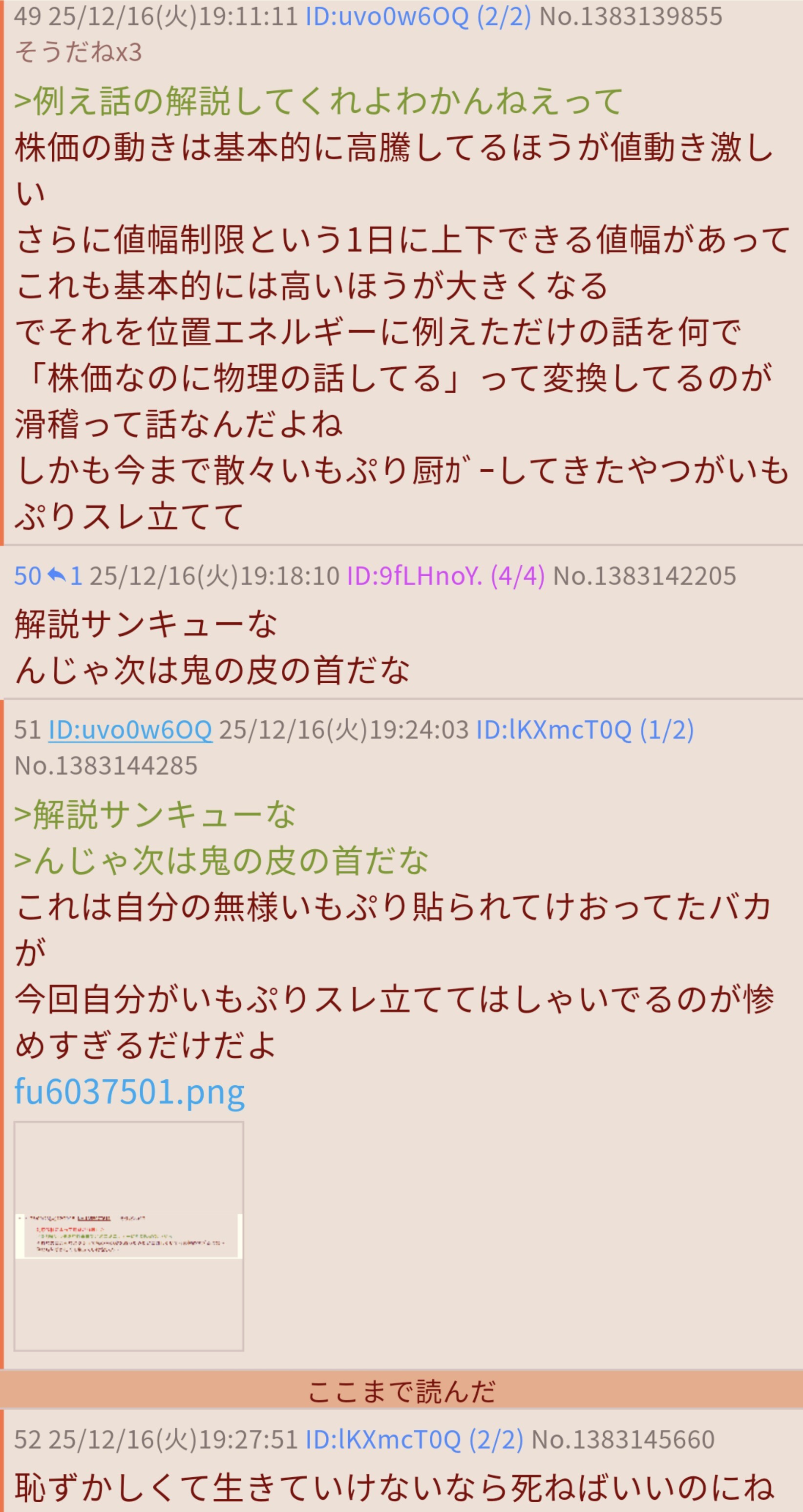 | … | 225/12/18(木)03:26:20No.1383594381そうだねx5また値動きと値幅制限を理解できなかったことを馬鹿にされに来たのかハヤト |