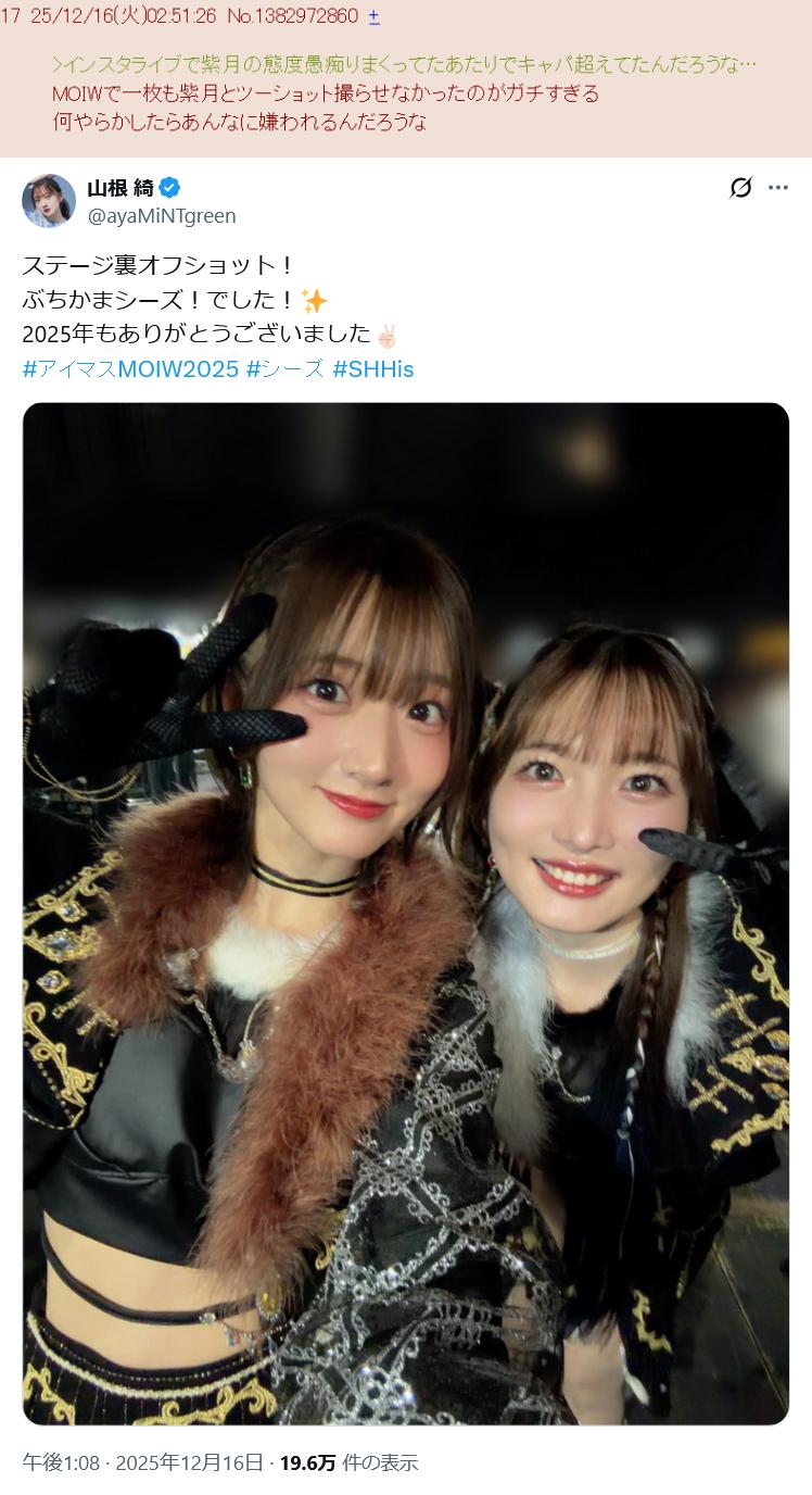 | … | 7625/12/18(木)07:23:13No.1383606426+コメは3人それぞれ単体の応援のぼりはもちろんユニットの応援のぼりも出てたのにシーズは美琴単体の応援のぼりしかなかったのは、なんというか察するものがあったよね… |