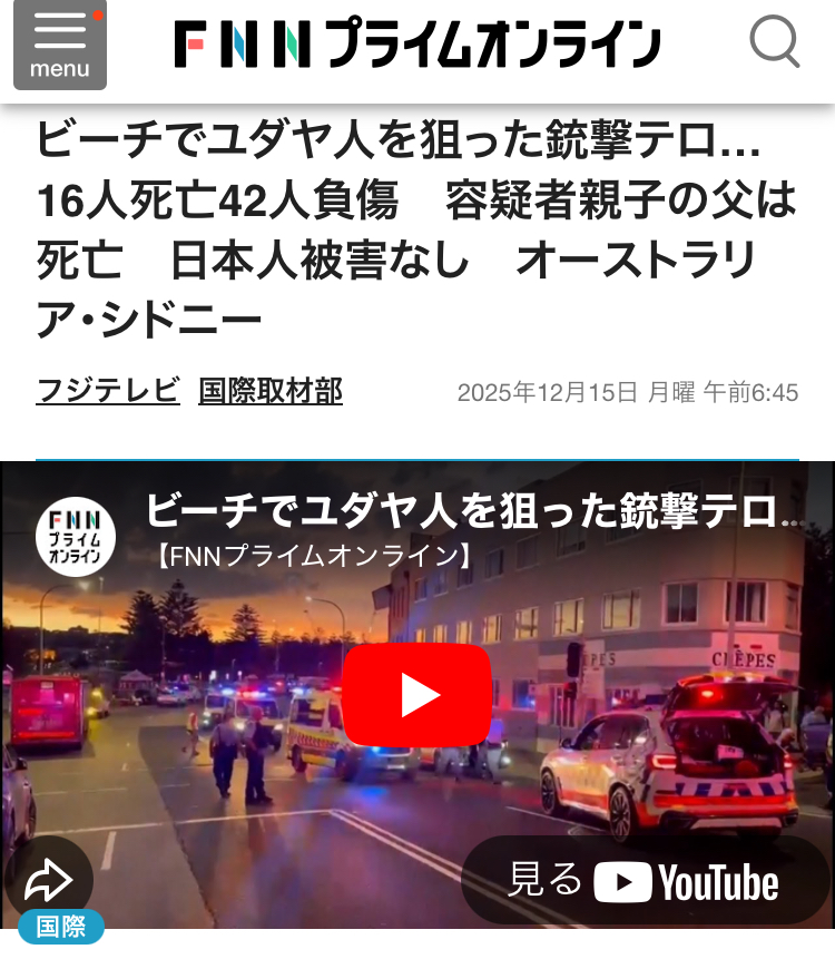 | … | 2825/12/18(木)09:31:26No.1383625321+オーストラリアってそんなユダヤ人に恨みや憎しみがある国だったのか |