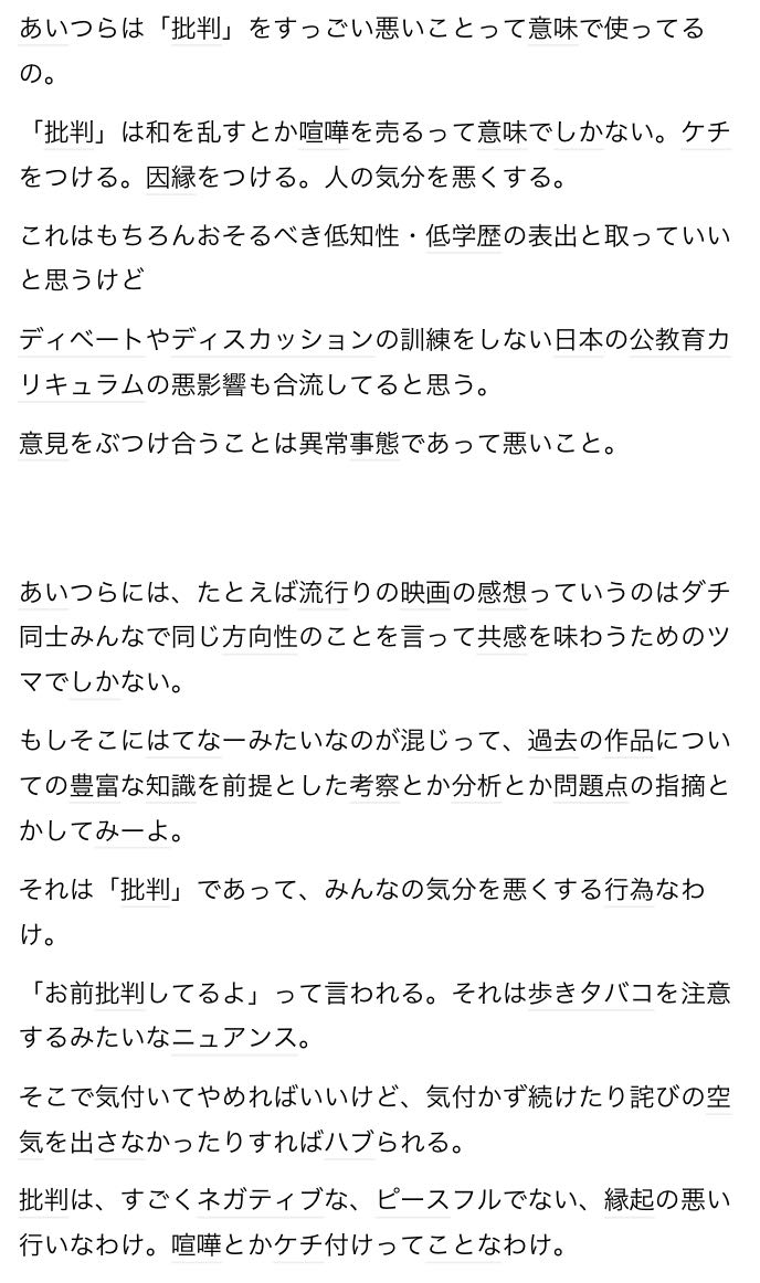 | … | 4525/12/18(木)10:47:38No.1383639173+批判は本来良し悪しをフラットに見る行為だったけど若者がネガティブな意味合いで捉えてるならそれはそういうふうに使って来た上の世代が原因だろう |