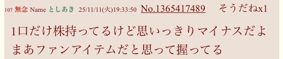 | … | 1425/12/18(木)19:29:14No.1383766788そうだねx1>スレ画1株だけ持ってるって意味で使ってるのか… |