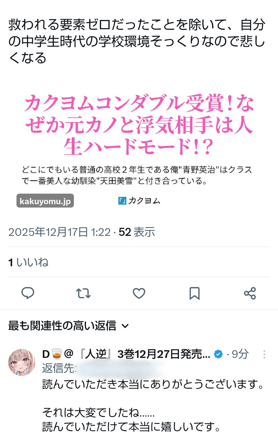 | … | 9025/12/18(木)20:31:34No.1383788303そうだねx3冴えない主人公が裏切られて才色兼備の完璧美少女に惚れられるって展開がテンプレ展開だからそこはもうどうでもいいというか… |