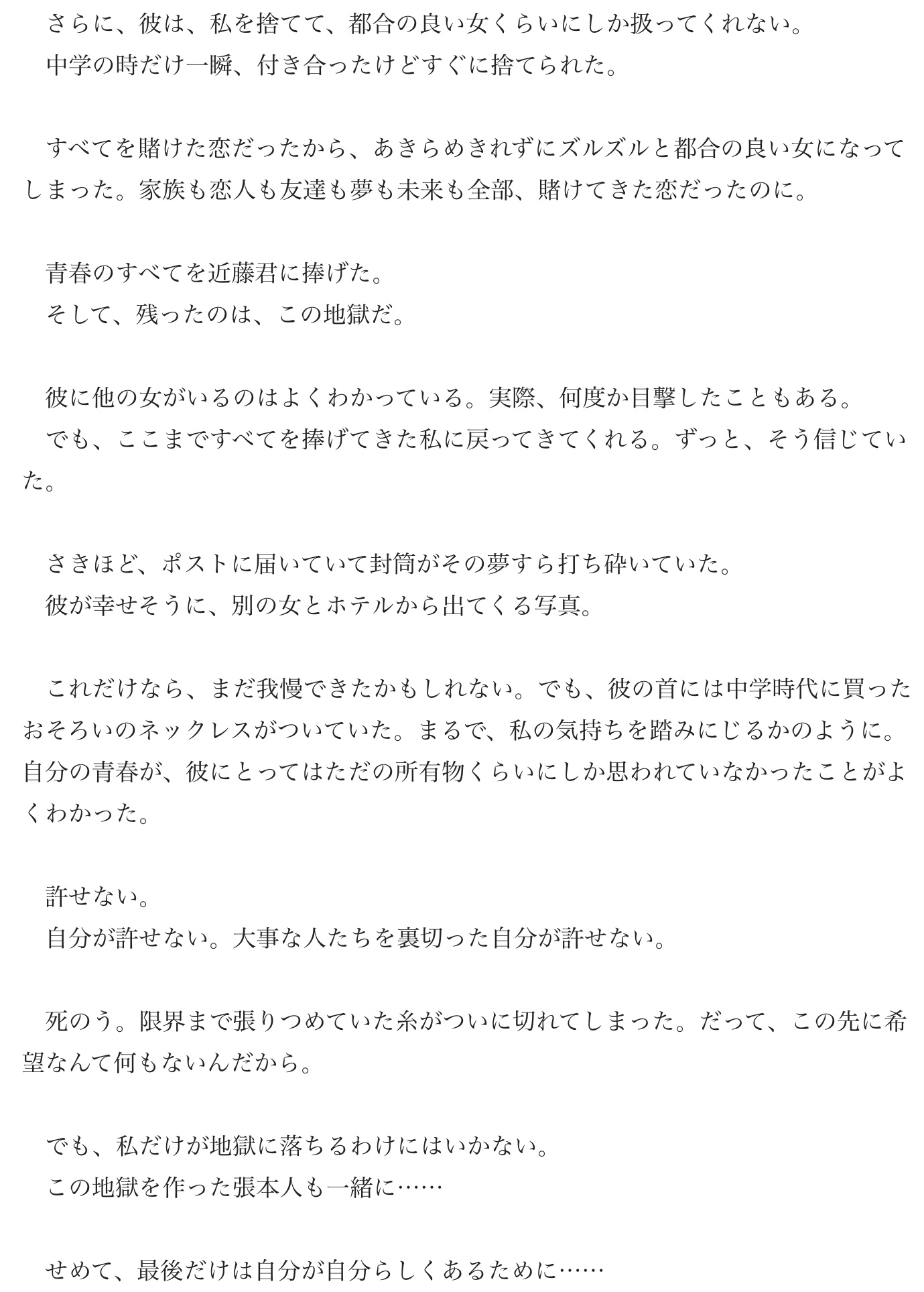 | … | 39125/12/18(木)21:12:13No.1383803246そうだねx2>チャラ男出てくるとこまで書くとしたらワンチャン出てきて青野に復讐してやる〜ってなってるチャラ男を美雪が刺す展開とかありそうあってほしい |