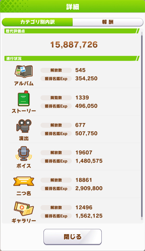 | … | 19225/12/18(木)20:36:57No.1383790208そうだねx2名鑑Expの詳細ボタンから内訳見れるけど歴代評価点のポイントに比べたら進行状況ポイントはだいぶしょっぱいよ! |