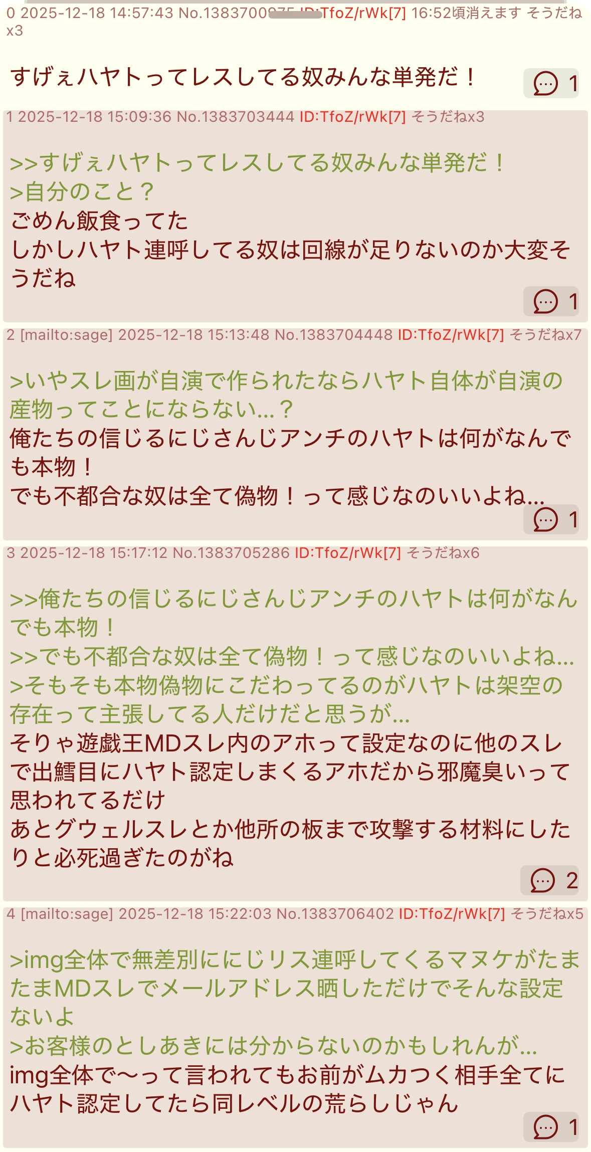| … | 31025/12/19(金)02:10:30No.1383889857+ハヤト…荒らしが下手すぎる |