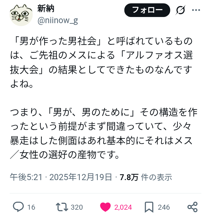 | … | 4525/12/20(土)01:49:05No.1384182368そうだねx3そもそも結婚する相手を選ぶ権利を女に渡したのが間違い |