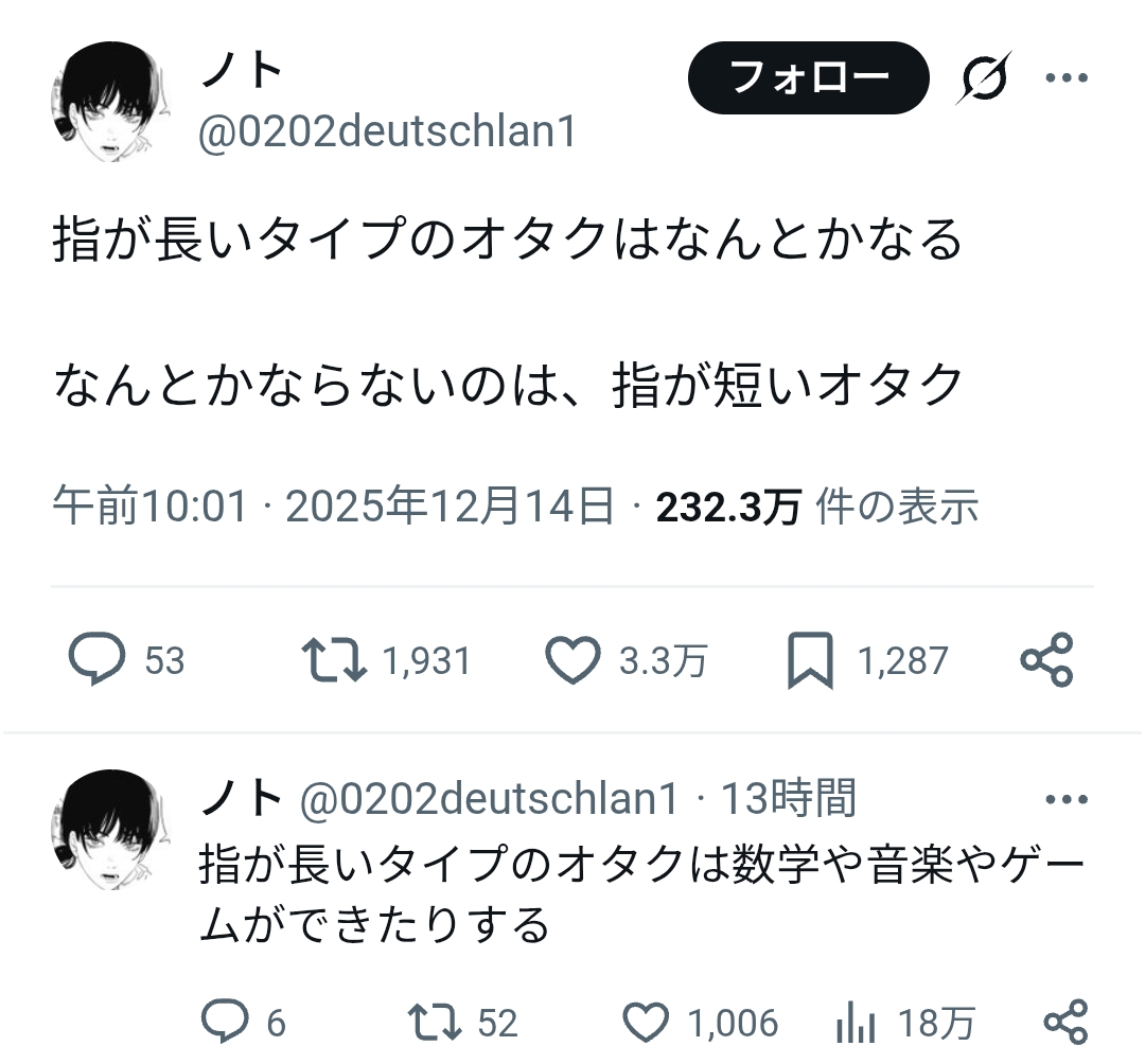 | … | 2025/12/20(土)15:15:22No.1384315413+指長い事自慢してる奴は身長低そう |