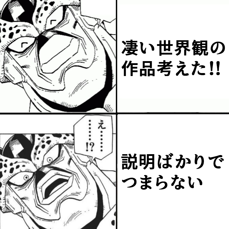 | … | 14425/12/21(日)08:36:42No.1384575082+>設定は説明されてこそ面白い面白いストーリーを用意するだけでは面白さが伝わらないのでどう説明するかが大切だ |