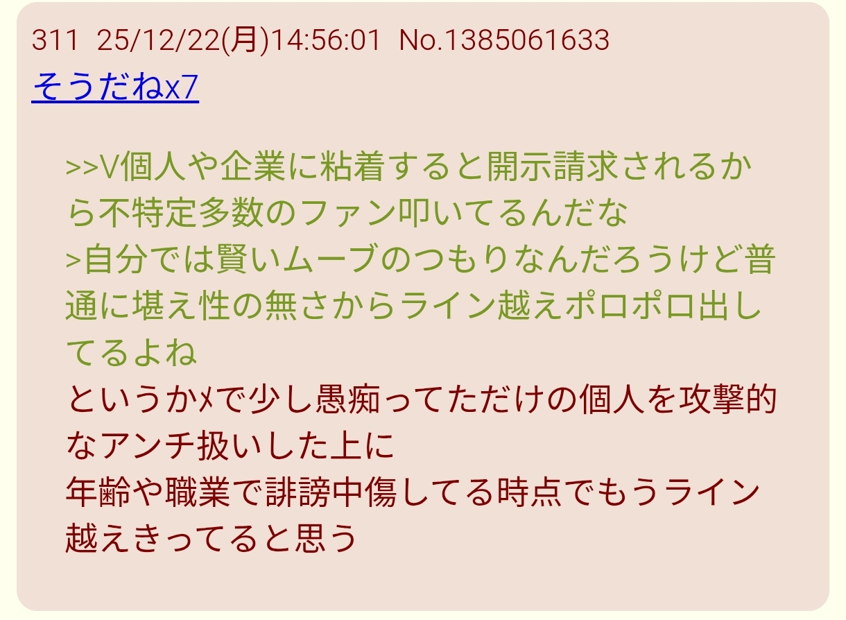 | … | 1225/12/22(月)16:39:24No.1385083806そうだねx13>そこまでVtuber憎める理由がわからない… |