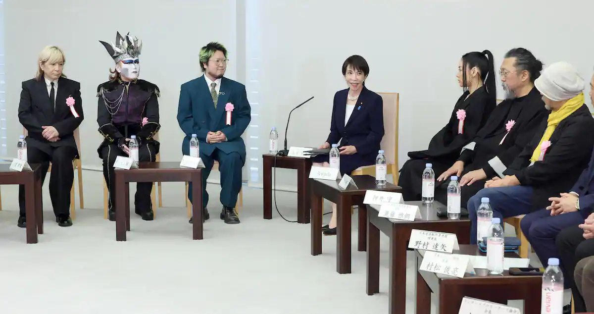 | … | 6925/12/22(月)17:44:11No.1385098941+首相官邸で22日、高市早苗首相とコンテンツ業界の意見交換会が行われ(左から)小室哲哉さん、デーモン閣下さん、こっちのけんとさん、Awichさん、村上隆さん、押井守さんが出席しました。 |