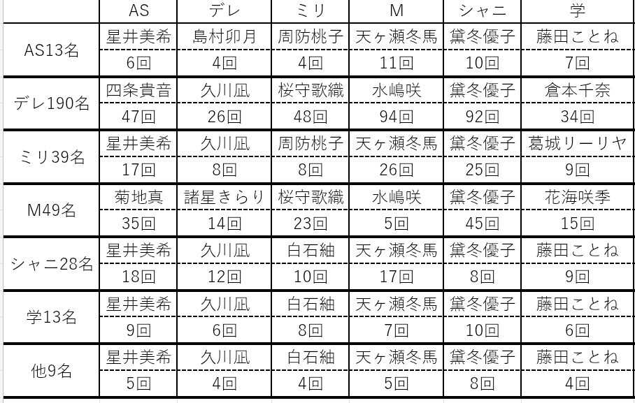 | … | 22525/12/23(火)14:59:28No.1385391020+しぶりんとか信号機とかその辺は5〜6人選んでたらほぼ入るんだから結果として多くなるの当たり前だろってなる |