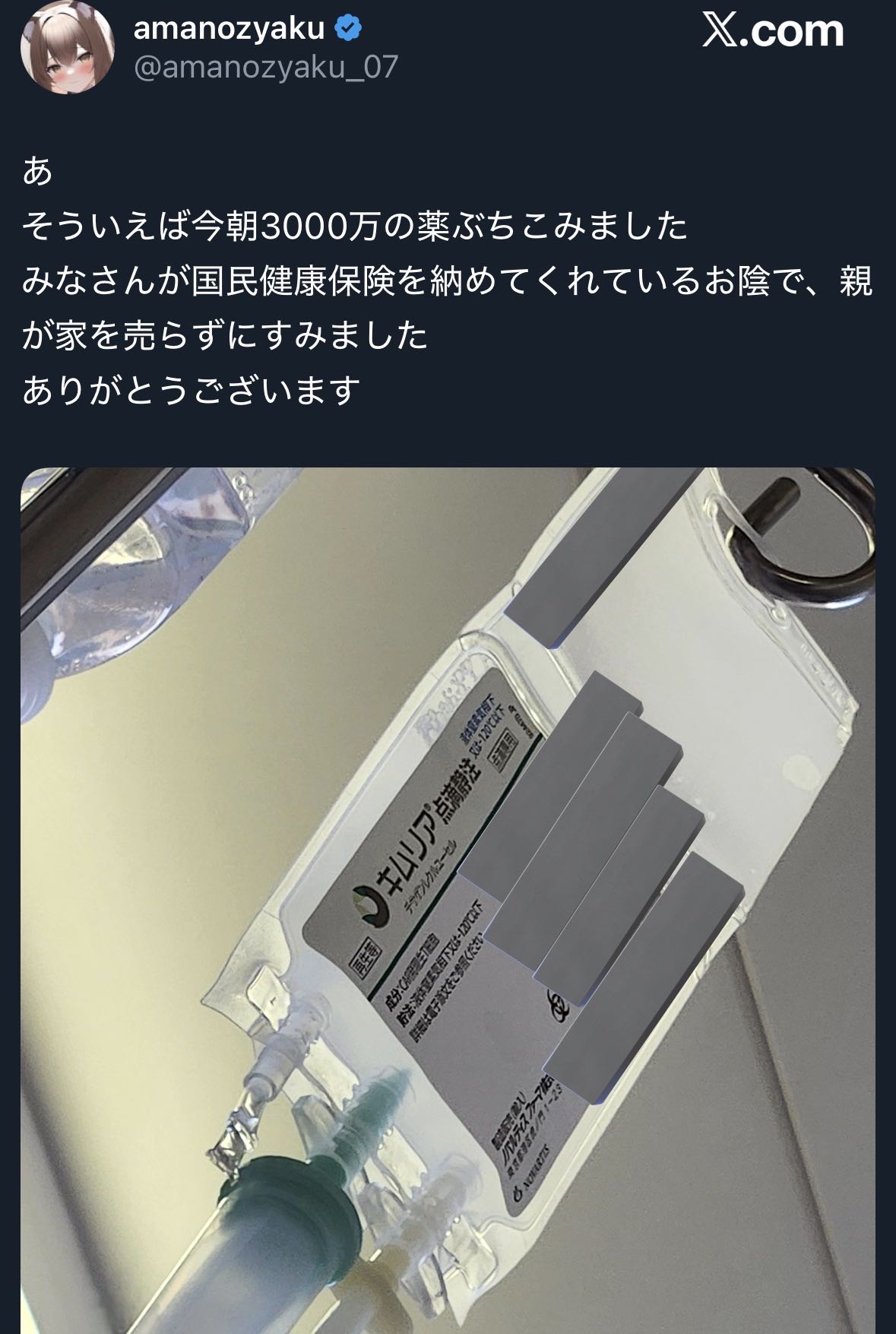 | … | 64325/12/23(火)22:27:22No.1385524296+親父が4年ぐらい前に難病の重症筋無力症になってずーっと特殊な薬飲み続けてるから皆保険制度ありがたいですよね |
