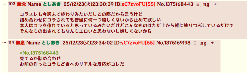 | … | 4925/12/24(水)03:53:51No.1385594457そうだねx7粘着くん再依頼100件分のスクショがまだなんだけどログ消えるまで逃げですか? |