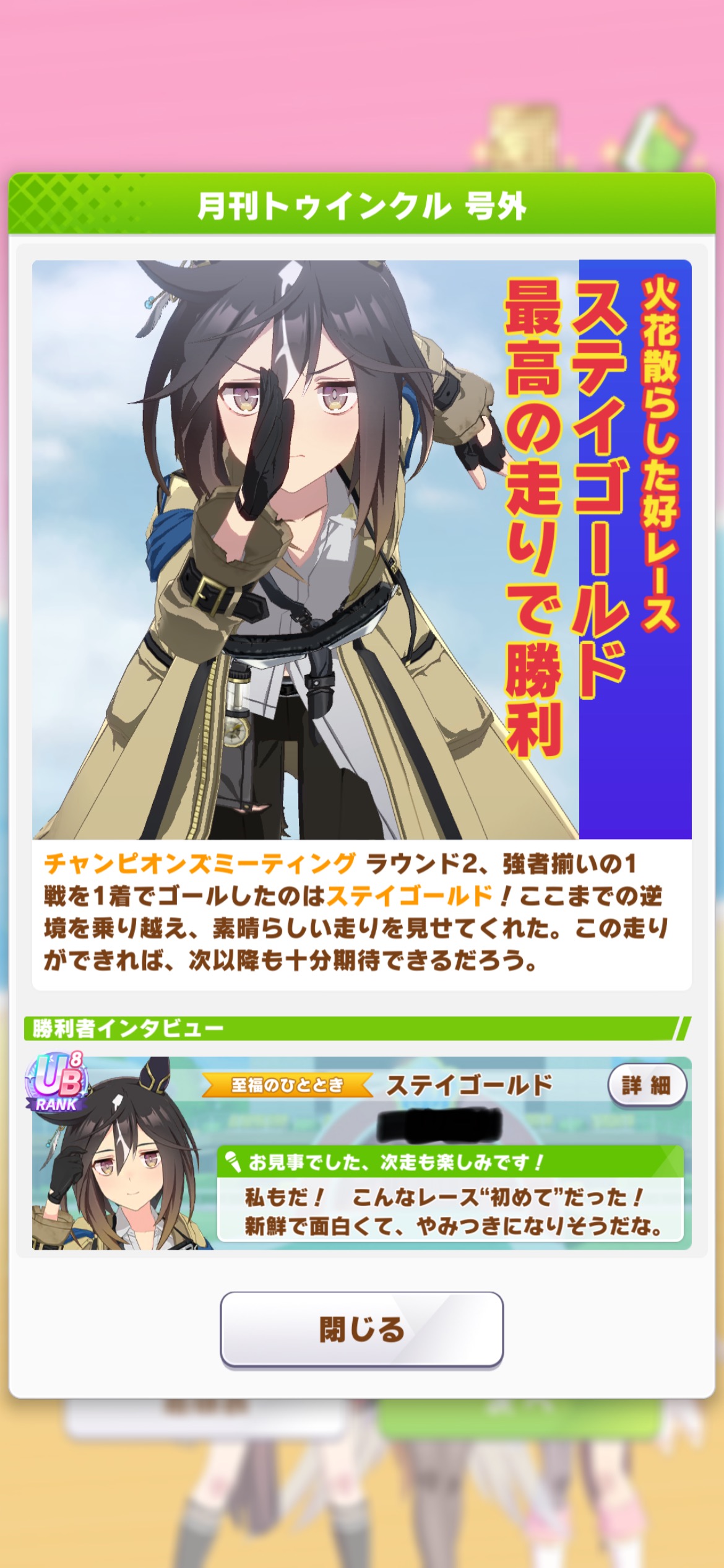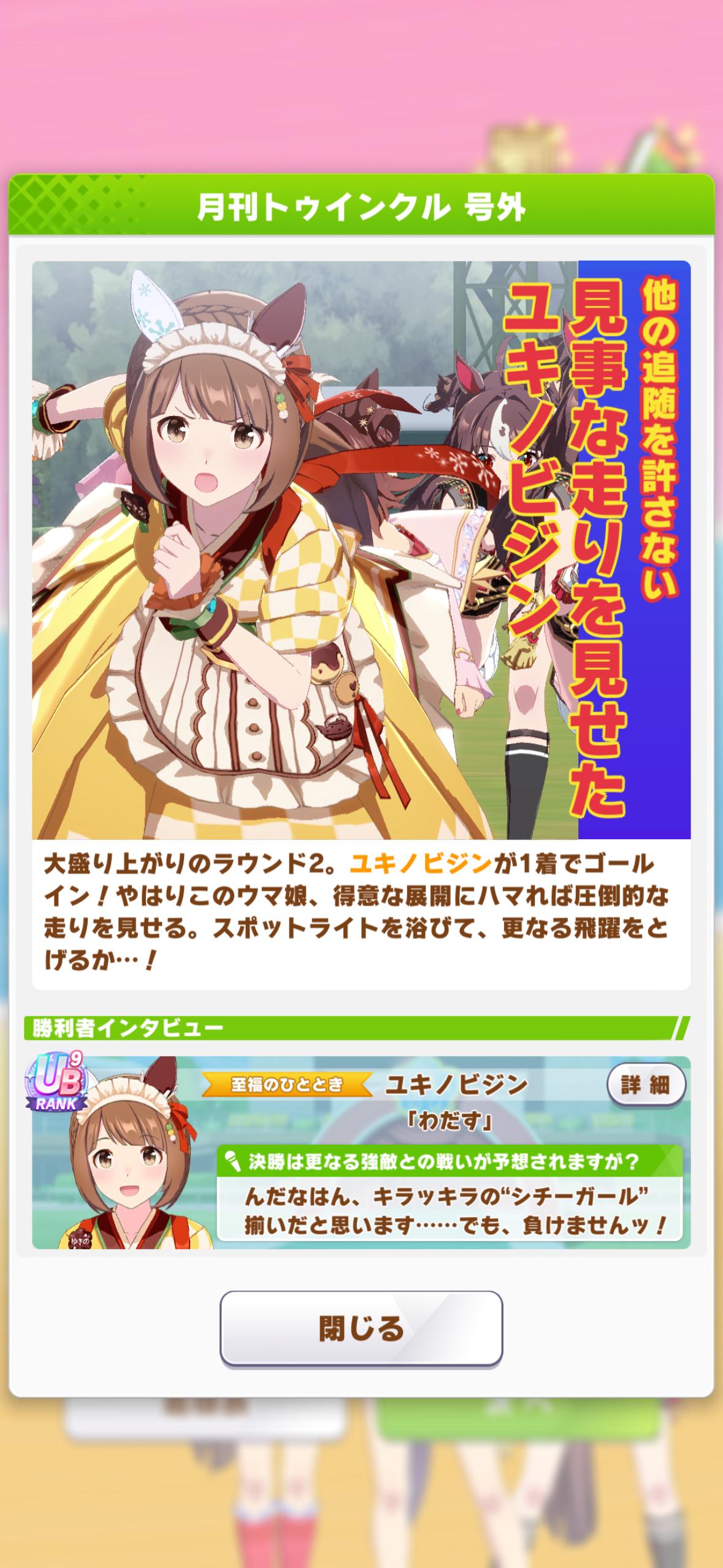 | … | 6325/12/24(水)10:41:14 ID:G1kcKiMwNo.1385634787+>>卿の新キャラは誰でしょうね >>ジェニュインが有力みたいですが >原作全然私なんですがどんなお馬さんなんです? フジさんと同じSS初年度産駒で岡部君が主戦の皐月賞MCS勝ち馬です マジで情報はこのくらいしかないです あとウイポだと岡部君が成長するのと相まってかなり強いです |