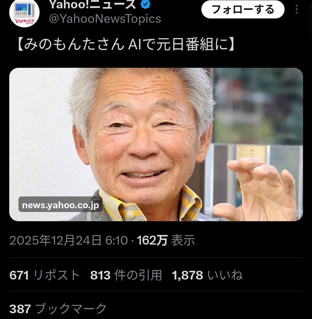 | … | 33325/12/24(水)13:05:53No.1385668557+昔横山やすしの追悼番組で最後に生前の声を繋ぎ合わせて横山やすしMADみたいなことやってた吉本興業はAI伝説の漫才師みたいなの積極的にやりそうと思ってたけどそういうのやってないよね |