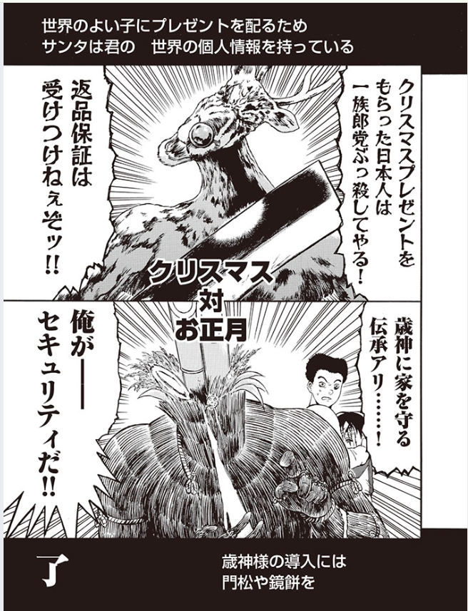 | … | 625/12/24(水)20:39:29No.1385789455+クリスマス勢力は格上っぽいサンタが死んだのに対して歳神勢力はスサノオレベルの神とも親しいとか勝ち目無さそう |