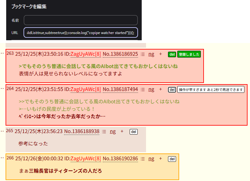 | … | 5025/12/26(金)00:02:46No.1386191003+おばあおばあ!この人あのあとちわたんの配信に襲撃して硬派を破壊してましたよ!!!! |