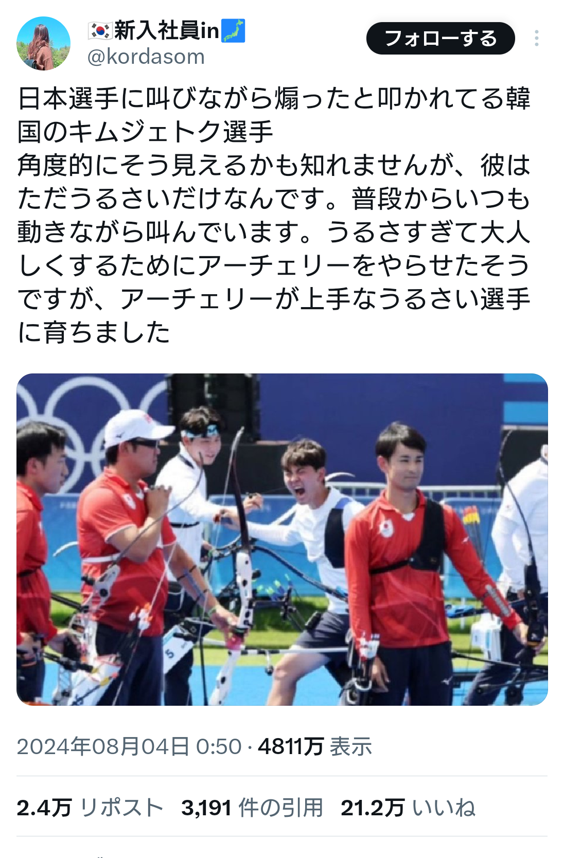 | … | 4925/12/26(金)11:35:33No.1386280592そうだねx5アーチェリーに力を入れてる韓国でオリンピック選手になるんだから本当に凄い選手なんだろうな |