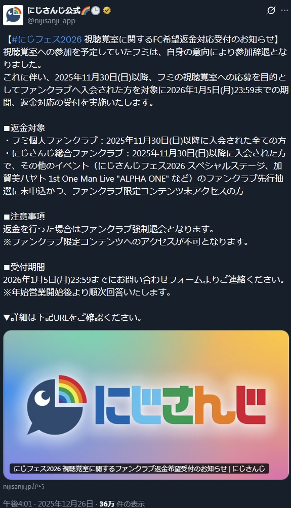 にじフェスでやるフミの視聴覚室目的で11月にファンクラブ入ったファンは返金するの?