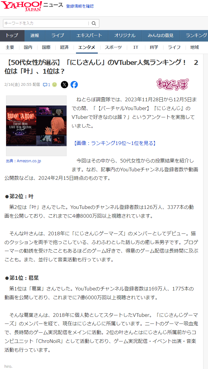 >30~40代に人気のライバー 葛葉