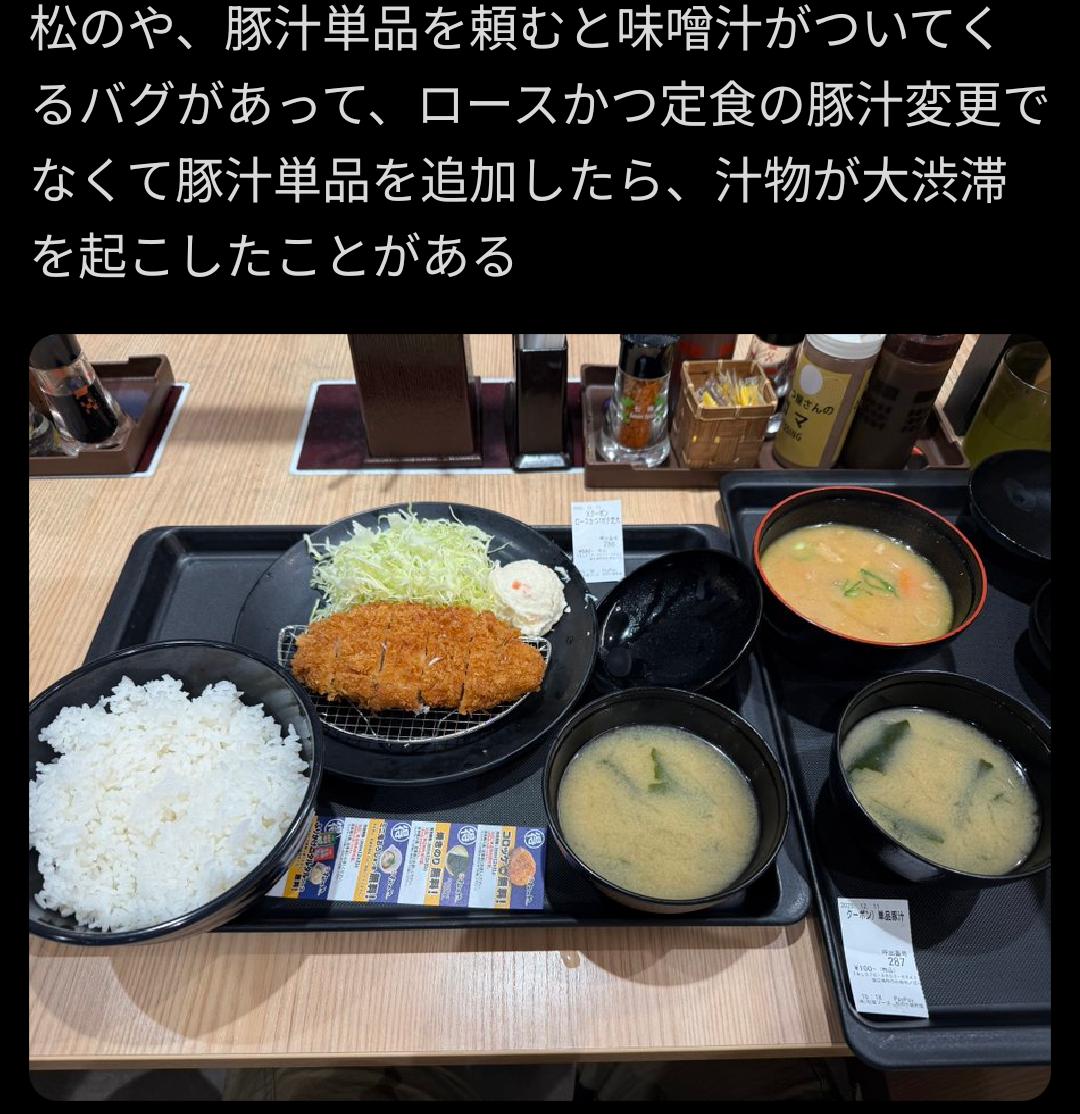 | … | 7125/12/26(金)22:48:23No.1386469071+>>あれ値段が単品豚汁と同じだから普通に味噌汁もらえる |