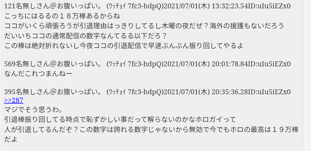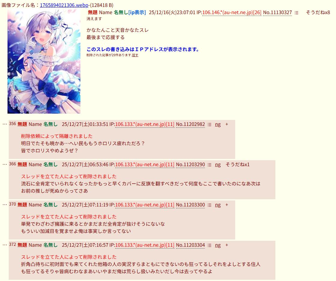| … | 32125/12/27(土)16:58:22 ID:LRPdRWy2No.1386680051そうだねx4>その横でホロ内対立煽りしてるのはなぜスルーしてるのこの人達 |