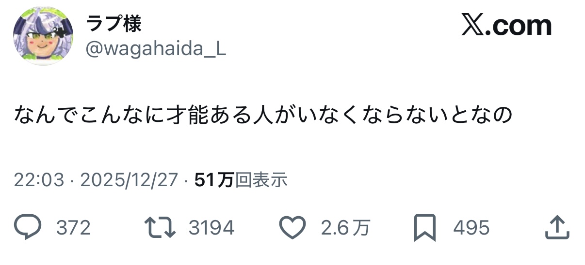 | … | 525/12/27(土)23:47:44No.1386830400そうだねx19>あの辞める理由でまだ会社を全肯定してるリスナーはすごいよね |