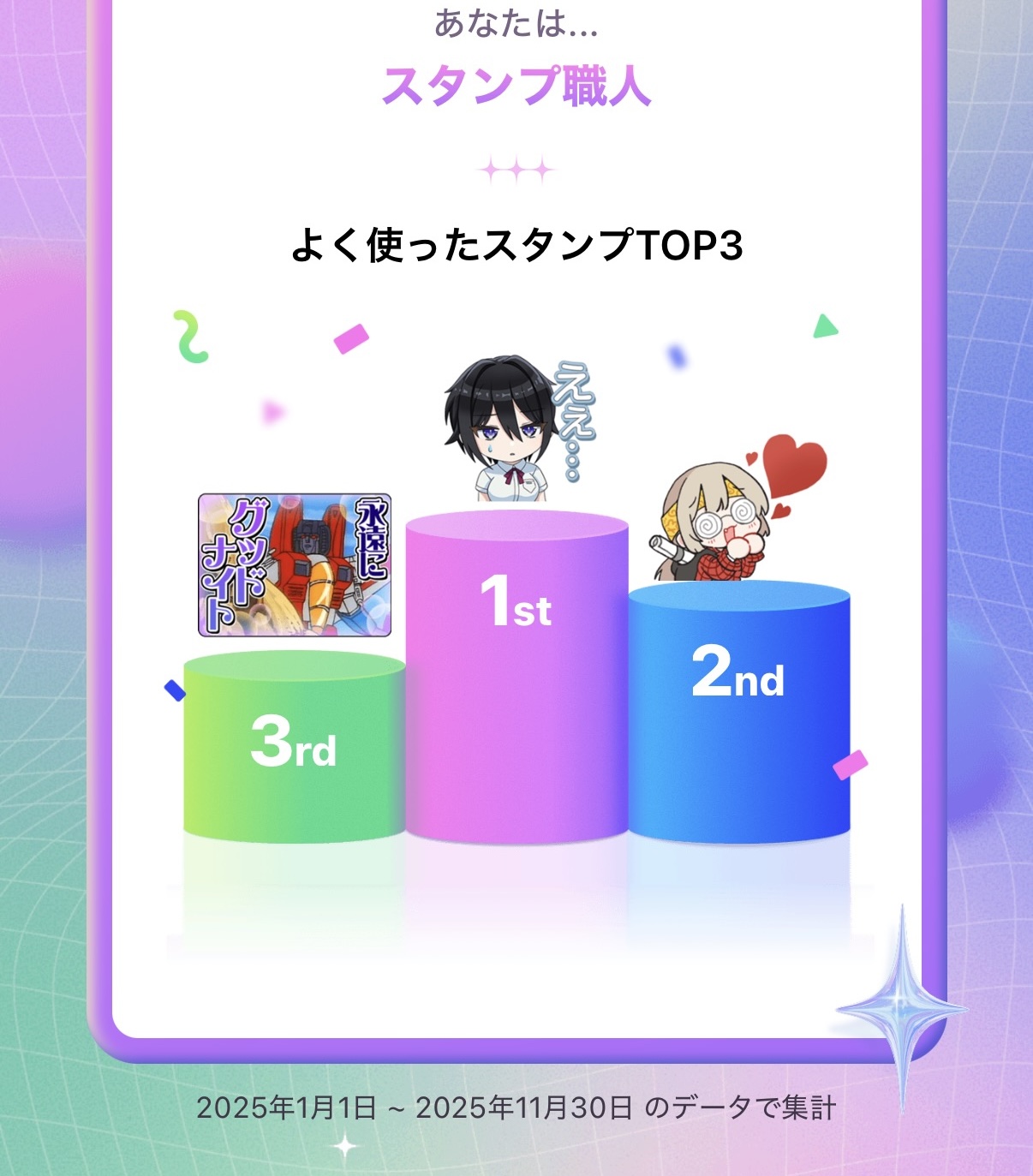 | … | 2825/12/28(日)08:17:51No.1386905331そうだねx1>自分が今年1番使用したLINEスタンプが娘だったよ |