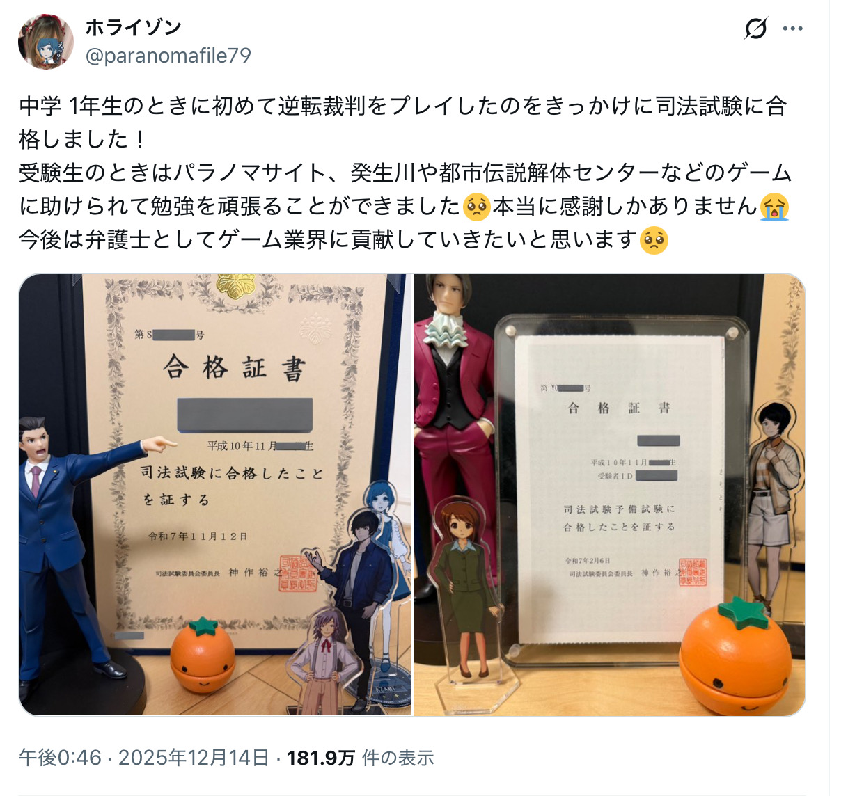 | … | 1125/12/28(日)10:48:44No.1386935909そうだねx1合格証書の隣にナルホドくんのフィギュア飾るの良すぎる |