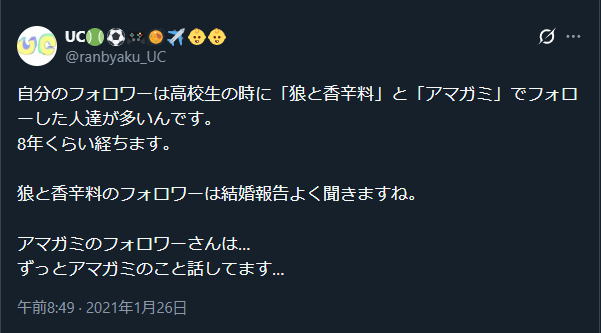 | … | 1625/12/28(日)11:55:59No.1386953428そうだねx2❌狼と香辛料読者は結婚できるがアマガミプレーヤーは結婚できない |
