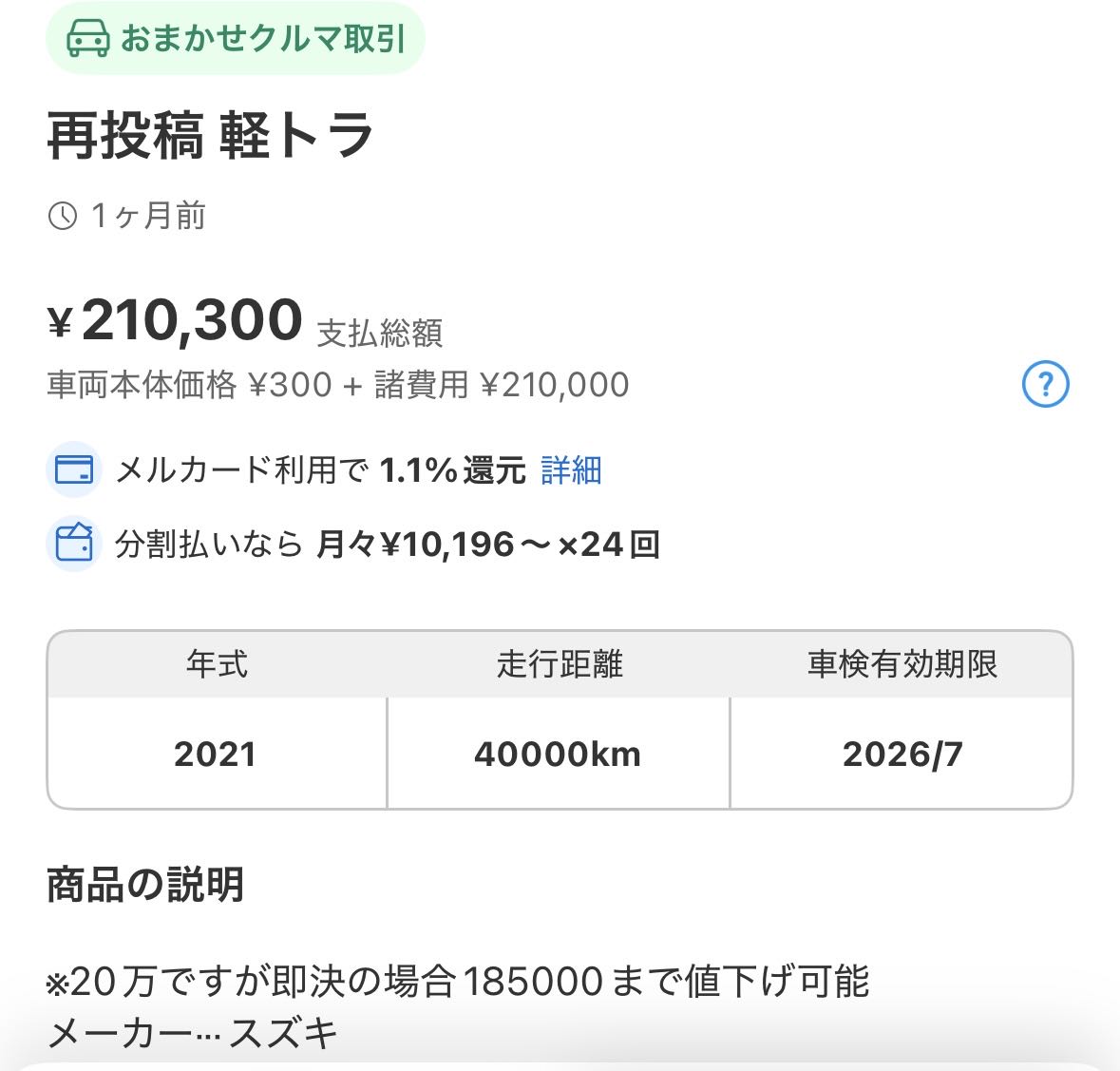 | … | 3625/12/28(日)18:13:47No.1387077249+そもそも普通の車と違って軽トラは使い潰す前提で乗ってるから程度いいやつもすぐ買われるし掘り出し物みたいなのはほぼない |