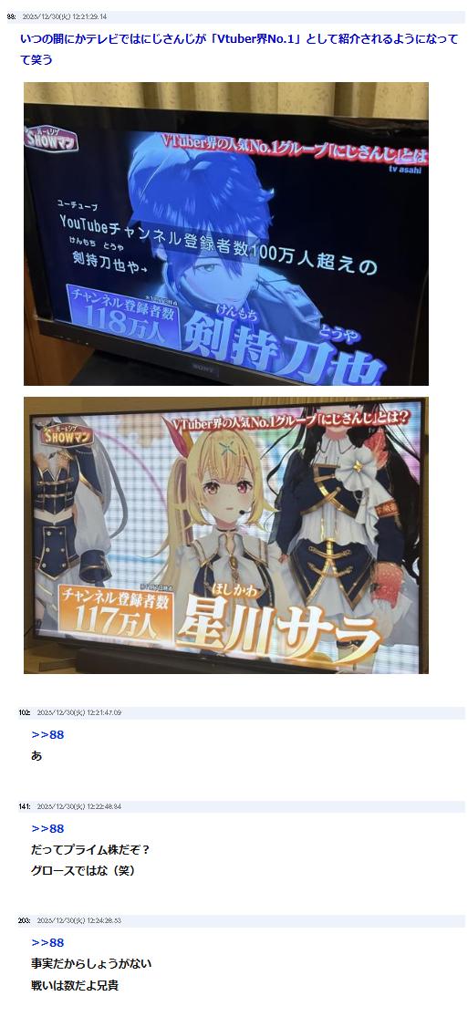 | … | 13225/12/30(火)18:40:01No.1387792695そうだねx1>登録者数も実績もおそらく仮想的であるホロライブに全く勝ててないのが現状だからな… |