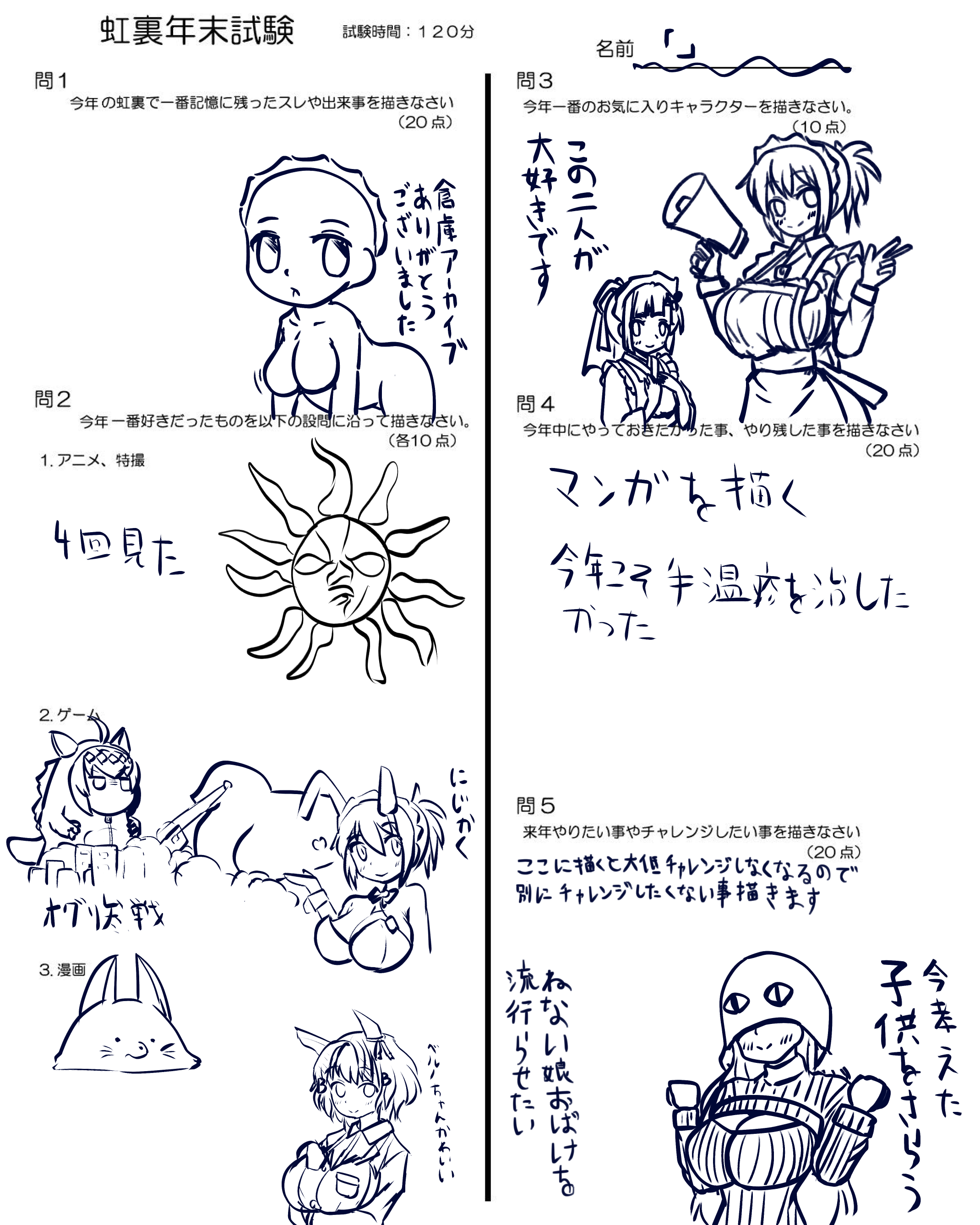 | … | 1525/12/30(火)18:04:55No.1387782024+実家に帰るまであと2時間あるからもう一枚なにか描けたらいいなというかそんなに時間あるならもっとテストを丁寧に書くべきだった |