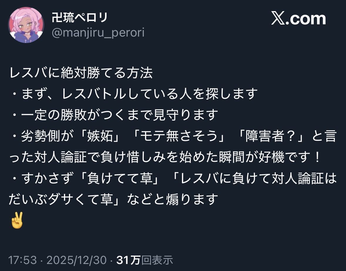 | … | 5025/12/31(水)02:04:02No.1387941613そうだねx1レスバは基本的に噛み付いた側が圧倒的に不利だから… |