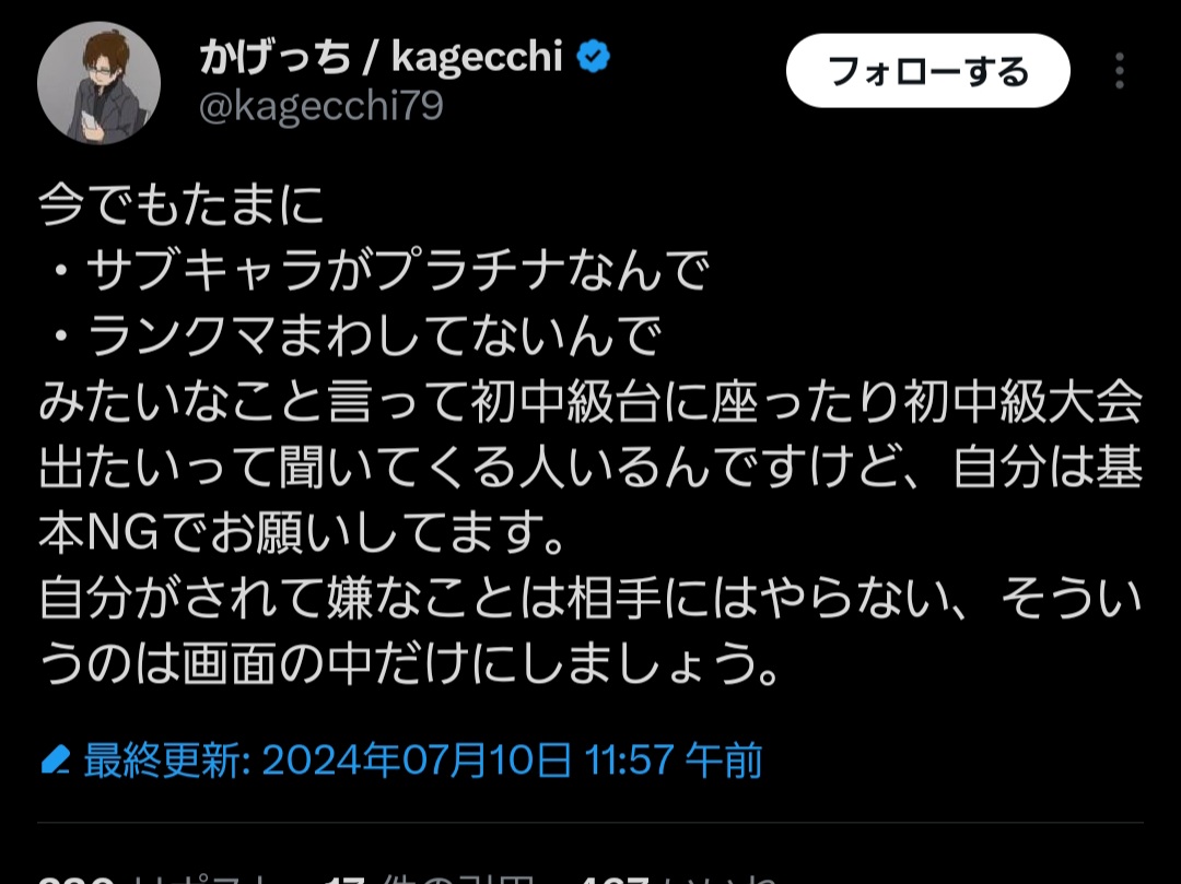 | … | 34325/12/31(水)11:30:37No.1388009083そうだねx5>それやった律可杯は文字通りゴールドプラチナ帯初狩りでその帯域から引退者出るまでに発展したからそれ以降サブキャラでランク調整ってのが格ゲーイベントでほぼ消えたんだよね |