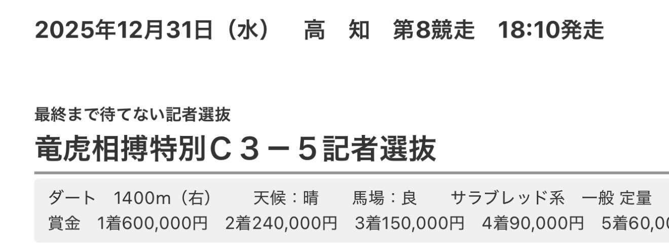 | … | 28425/12/31(水)10:12:05No.1387989853+今日はファイナルレースに相当する記者選抜レースがもう1レースあることを忘れてはいけません |