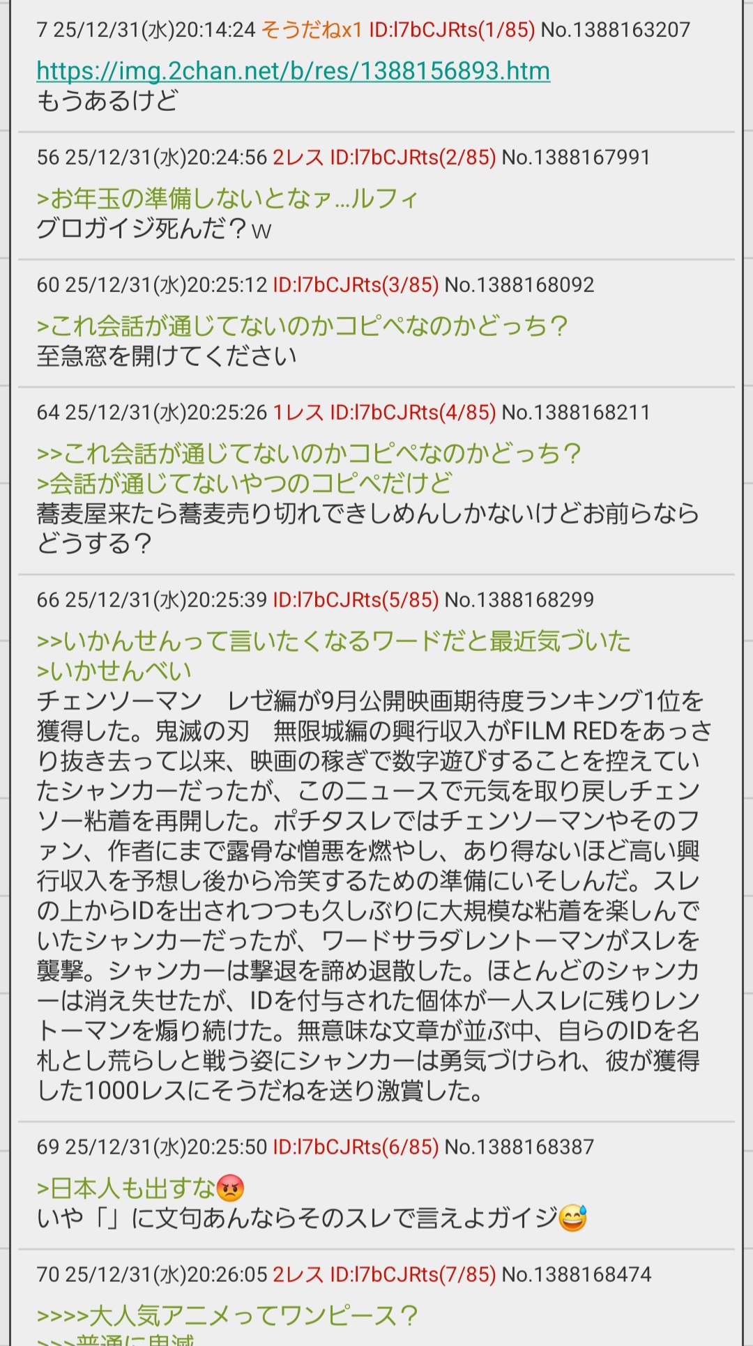| … | 4625/12/31(水)20:56:11No.1388181016+おまえらあと3時間で年越しなのにおれとマッマが喧嘩して悔しくないのかよ! |