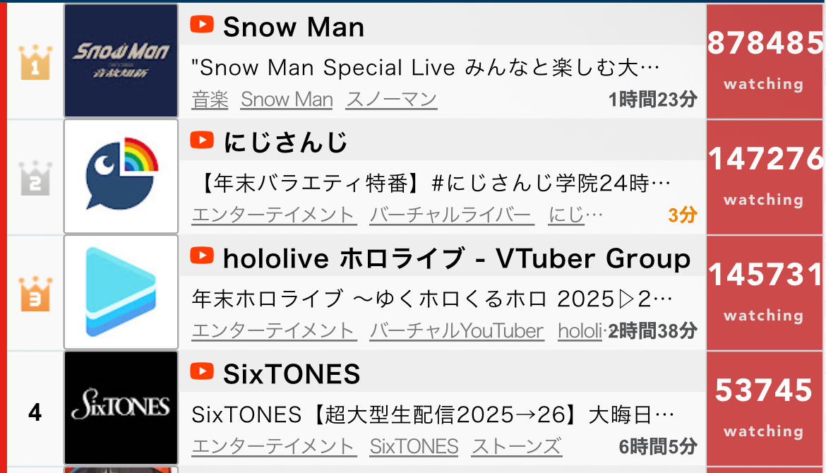 | … | 25825/12/31(水)23:29:26No.1388263398そうだねx4ていうか年末年始の配信なんて特殊な状況すぎてこれで何かを測れるようなもんじゃなくね? |