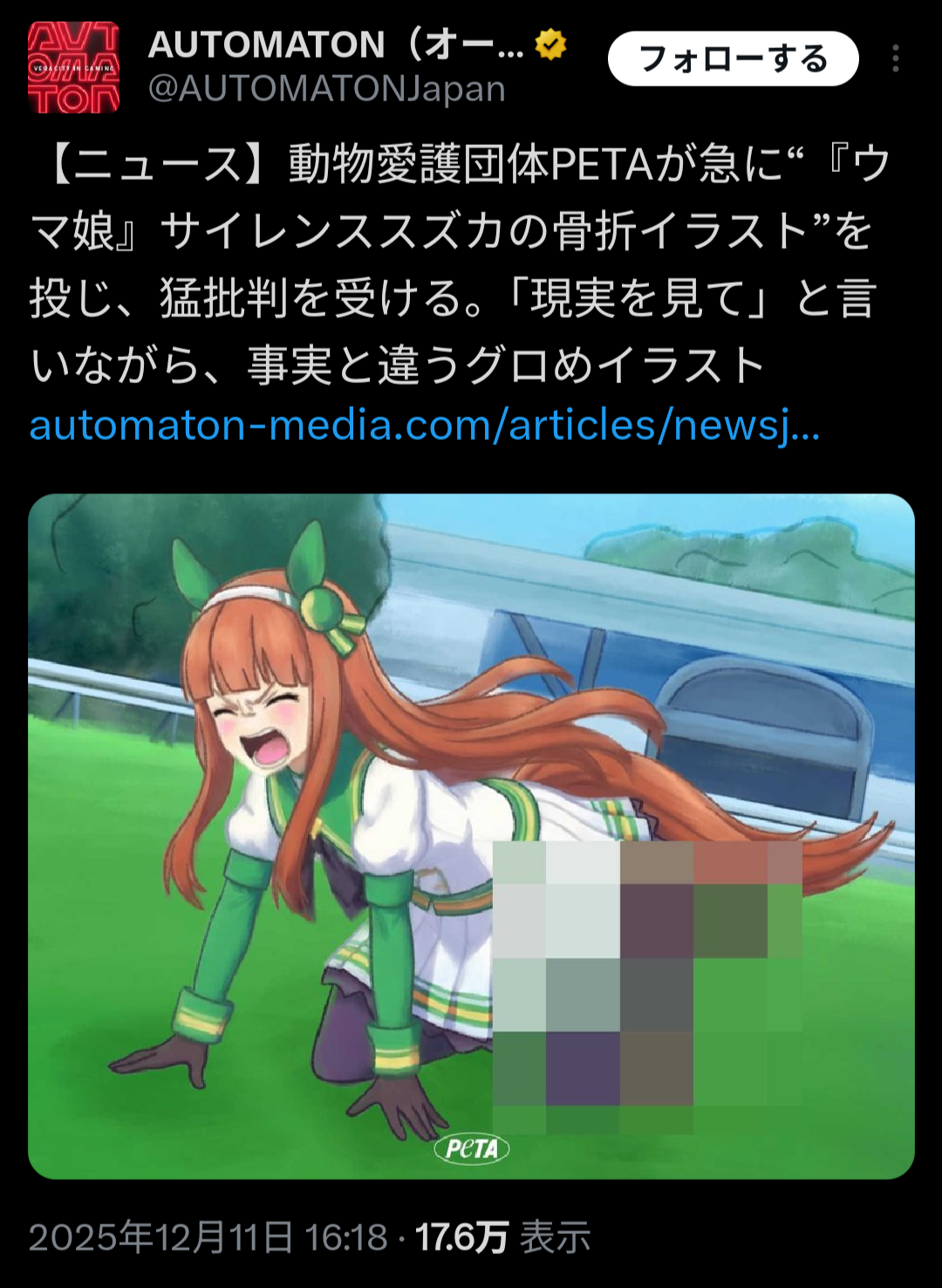 | … | 3526/01/02(金)10:46:02No.1388706663+そもそもとして開放骨折してないサイレンススズカでこういうの書いてる時点で一切敬意とかはない |