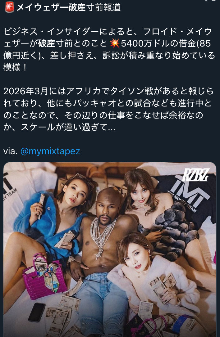 | … | 9226/01/02(金)14:19:28No.1388760885+>ビジネス・インサイダーによると、フロイド・メイウェザーが破産寸前とのこと💥5400万ドルの借金(85億円近く)、差し押さえ、訴訟が積み重なり始めている模様! |