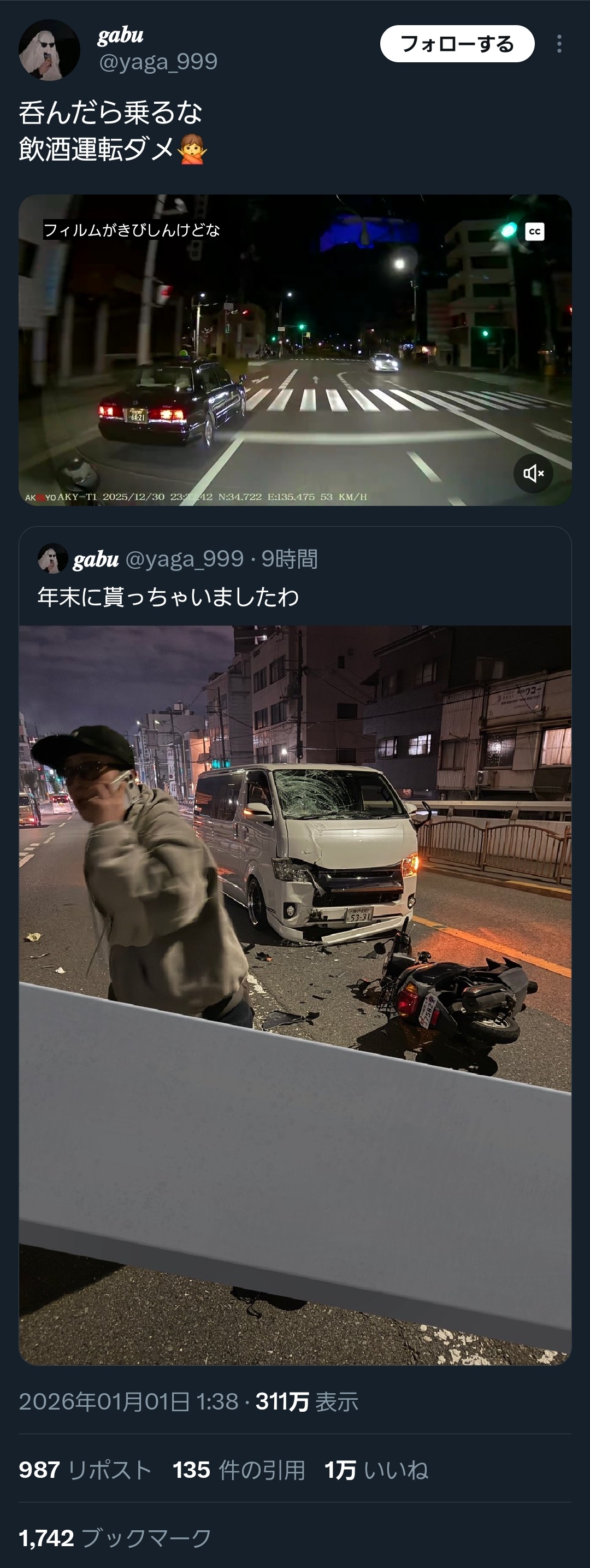 | … | 2026/01/02(金)14:49:50No.1388767967+左に避けたら高速で側面に突っ込まれる恐れがあった |