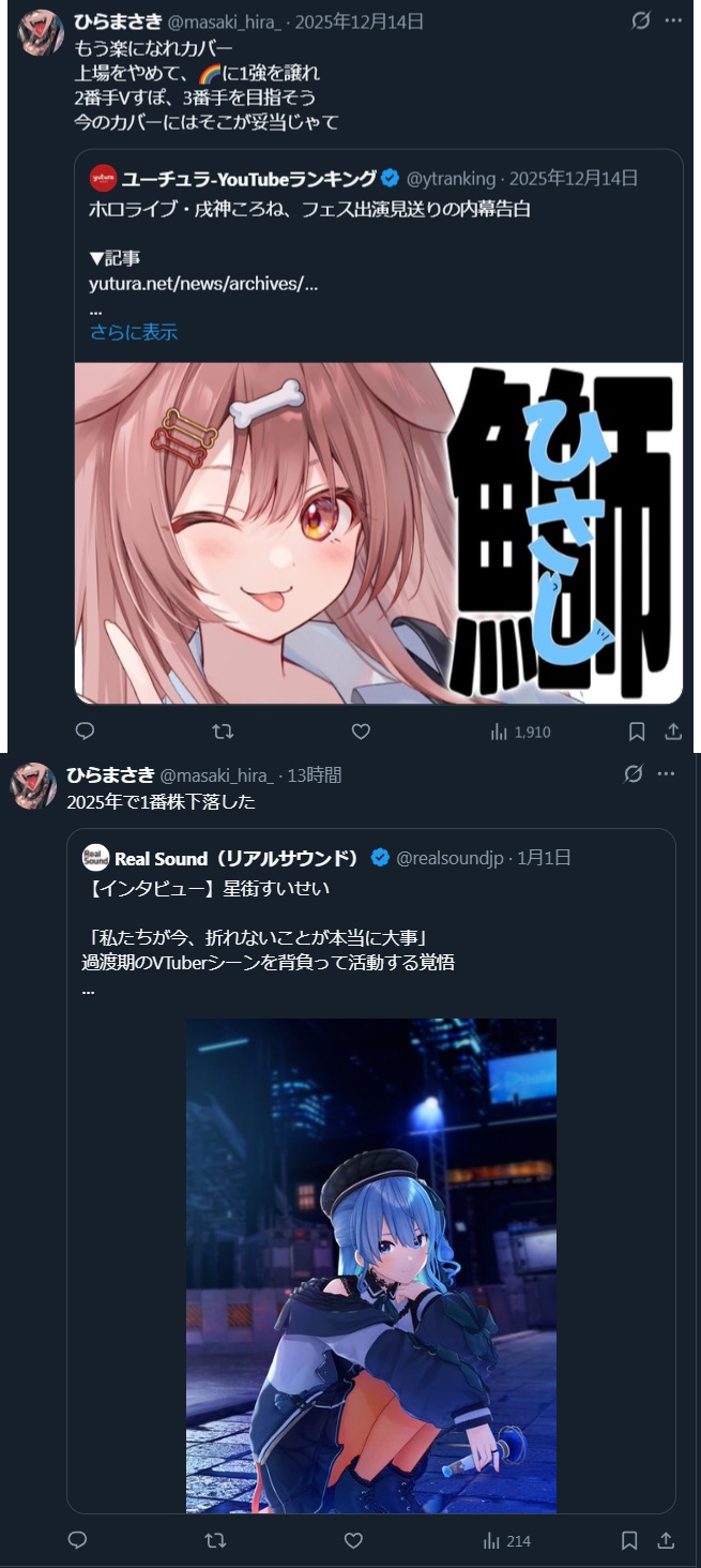 | … | 6726/01/02(金)21:37:24 ID:tmbRVewUNo.1388891862そうだねx3>今どきクリスマス律義に二人で配信休むの尊いよね |