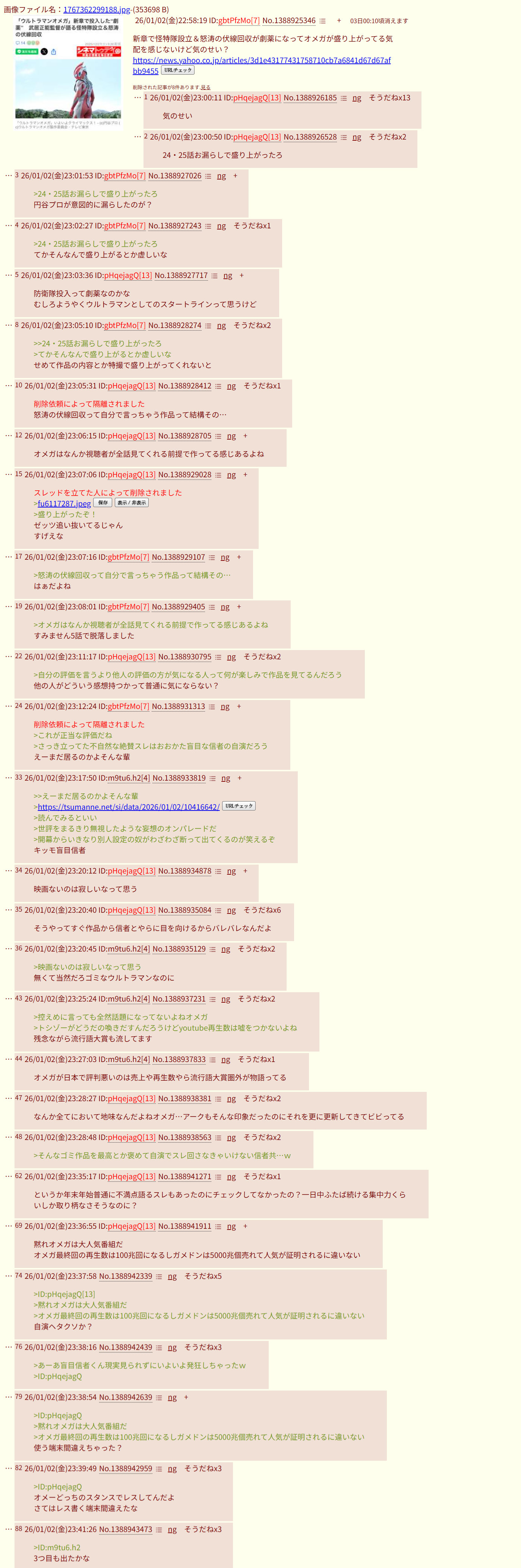 | … | 10526/01/03(土)00:01:47No.1388950124そうだねx2消されたレスどっちもID出ててダメだった |